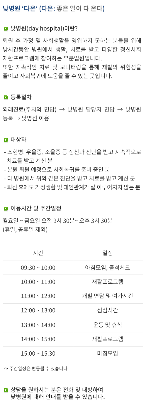 부서안내   층별안내   사회사업실   낮병동   병원둘러보기